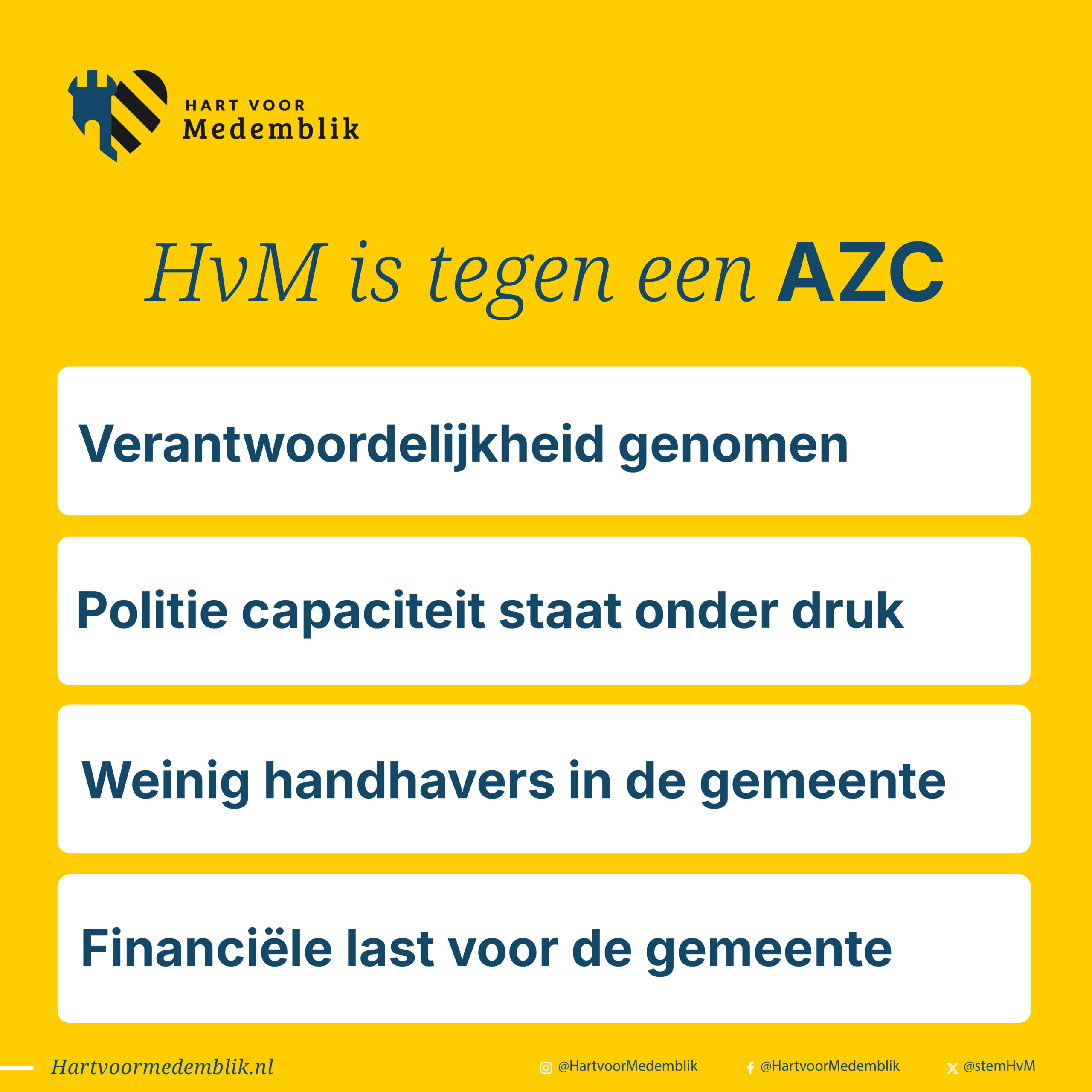 Hart voor Medemblik staat voor een menselijk, maar realistisch asielbeleid. Onze gemeente heeft al verantwoordelijkheid genomen door honderden Oekraïense vluchtelingen op te vangen. Toch zeggen wij nee tegen een AZC, omdat Medemblik dit niet aankan. We kunnen niet iedereen helpen.